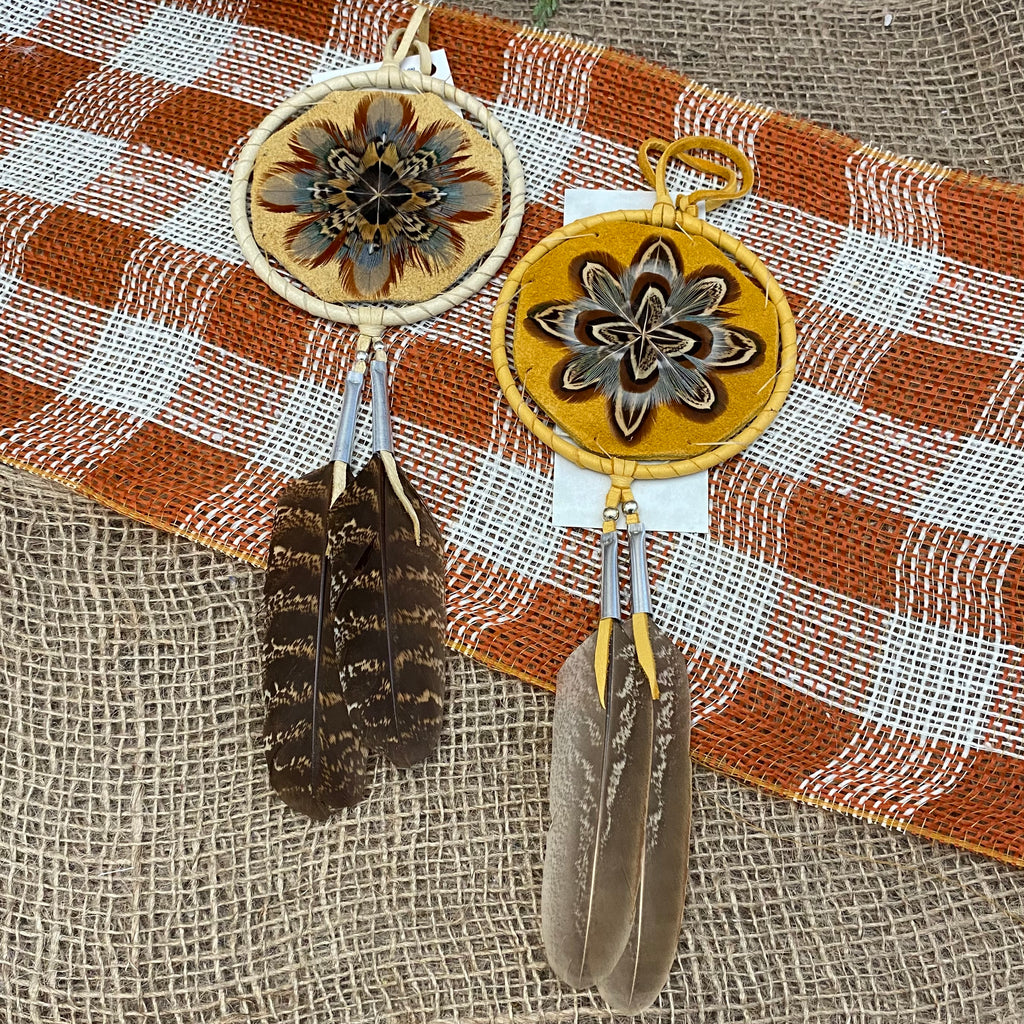 4” diameter hanging in either tan or black leather. Adorned with a unique pheasant feather design