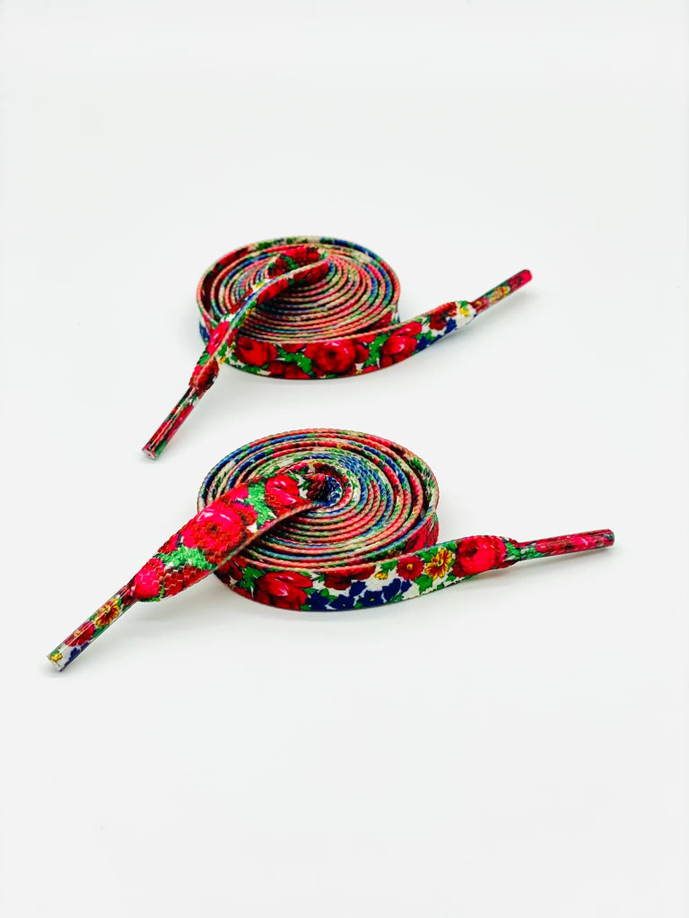 The main colour is White with red flowers. Order comes with 2 laces as the pair. Length is 130 cm fits a regular adult size sneaker.